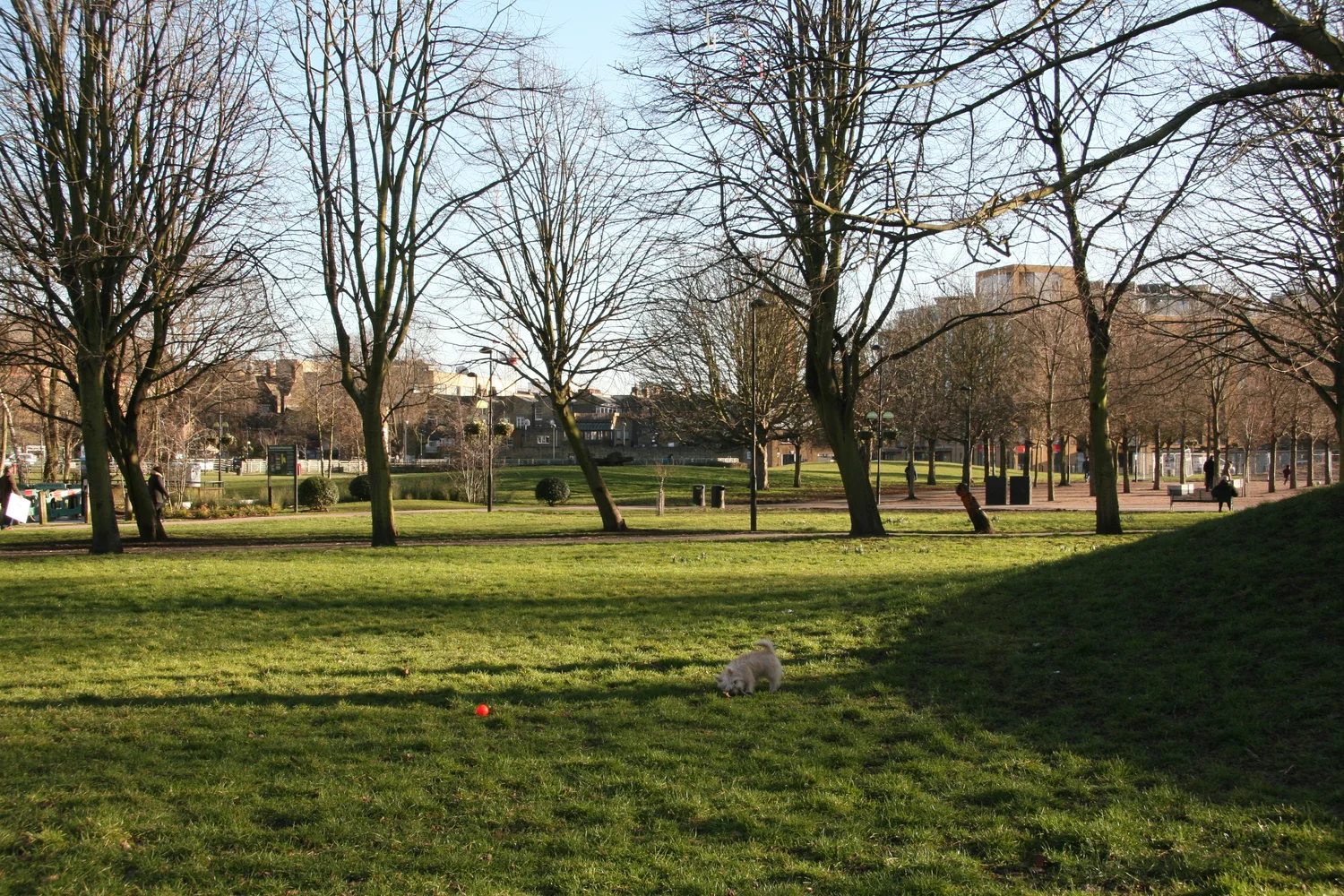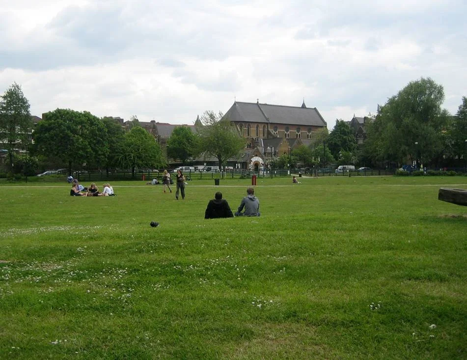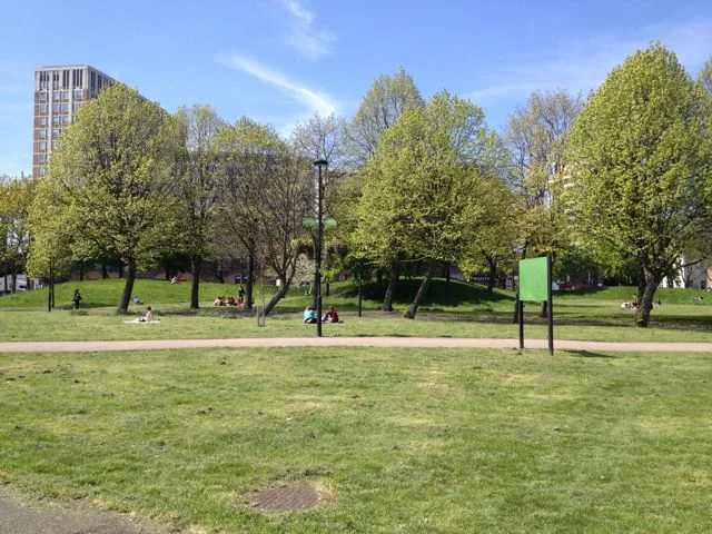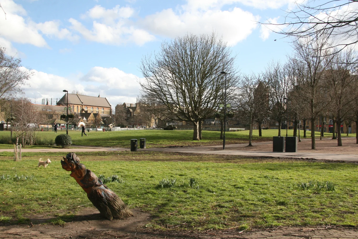 The main lawn overlooking Vauxhall City Farm with Friedel Buecking's Sculpted bench in the foreground
