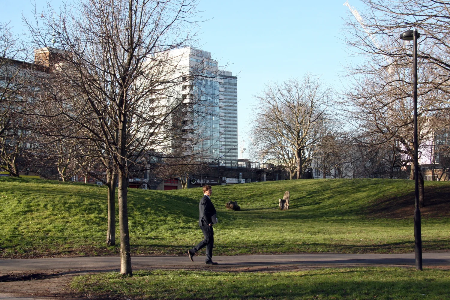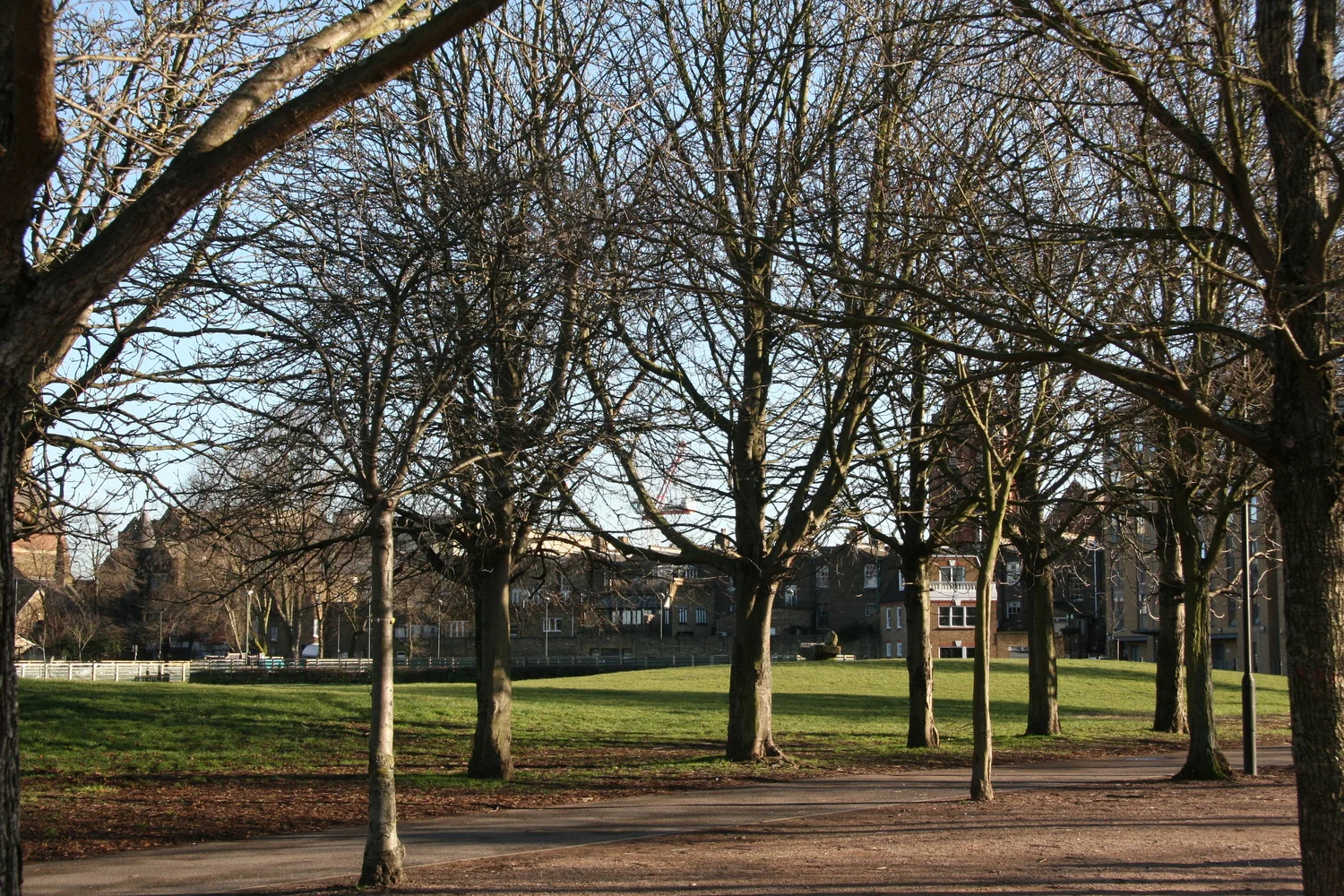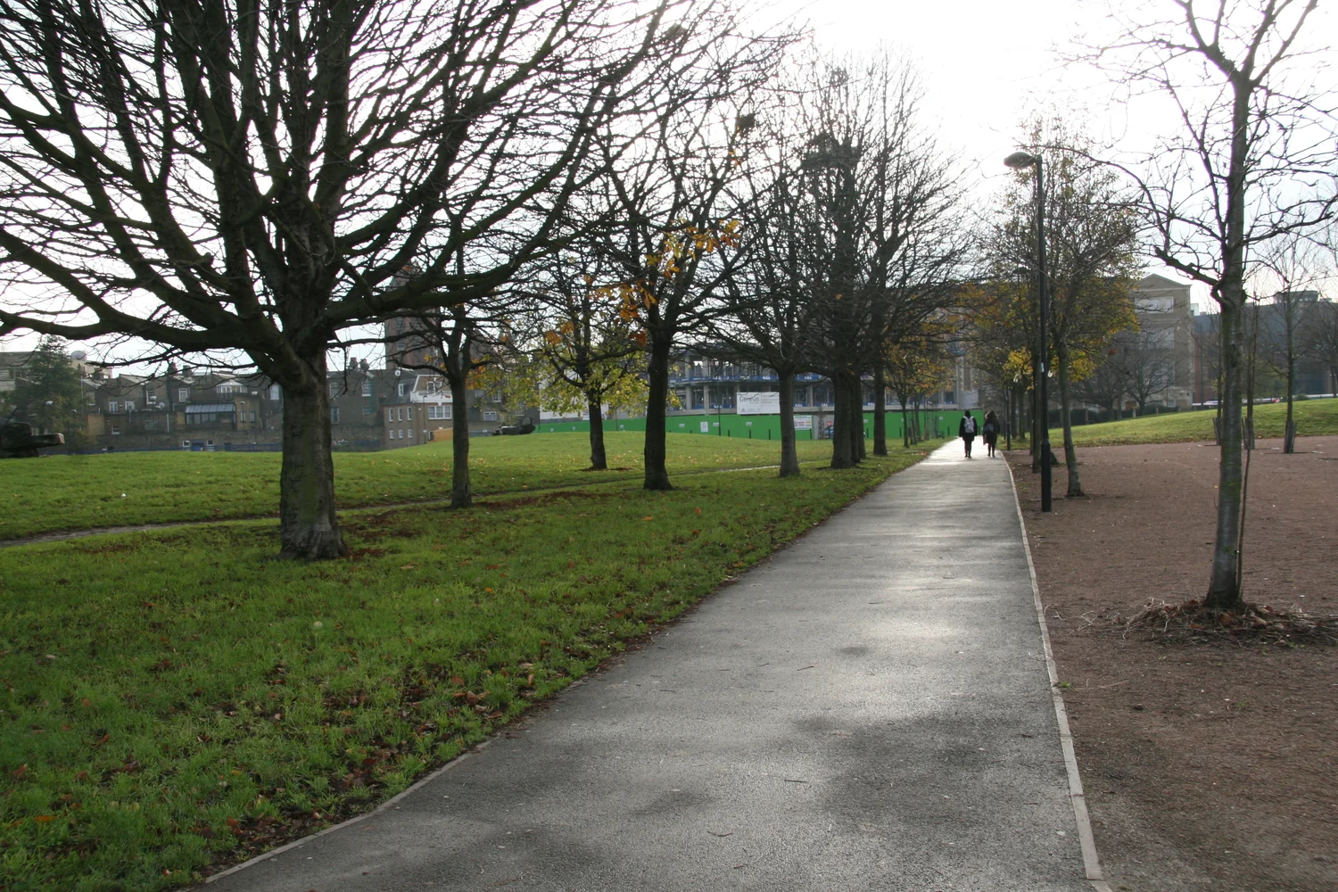 The main lawn overlooking Vauxhall City Farm with Friedel Buecking's Sculpted bench in the foreground